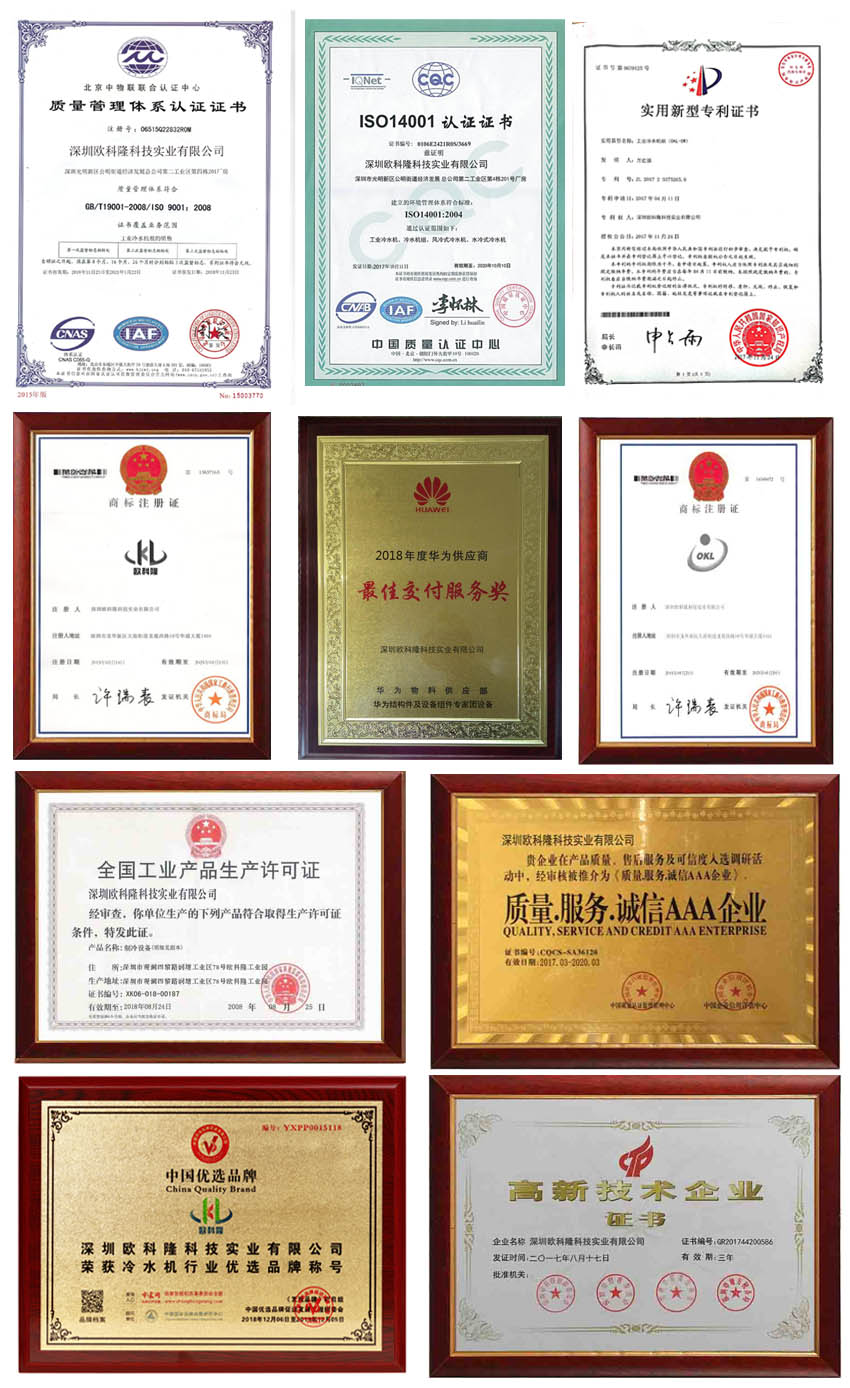 全國工業產品生產許可證、CCTV發現品牌、冷水行業中國優選品牌的榮獲,昭示著歐科隆制冷從勝利走向勝利。經由權威部門審核,歐科隆全面通過高新技術企業認證,獲得政策的積極幫扶我們會走的更遠更好。感謝北京某評選平臺,給予本企業高度評價,這雖然是昨天的榮譽,我們會當做明天的座右銘。感 謝阿里云網絡服務器機構給予認證,我們會以此為榮繼往開來,書寫嶄新的篇章,為開拓企業美好的明天,肩負的社會責任的持續奮斗。商標是企業發展立足的一桿旗幟,一面大纛,歐科隆全體同仁愿做扛旗者,護纛人,把這面光榮的旗幟插遍全球是我們的夢想和百年大計。